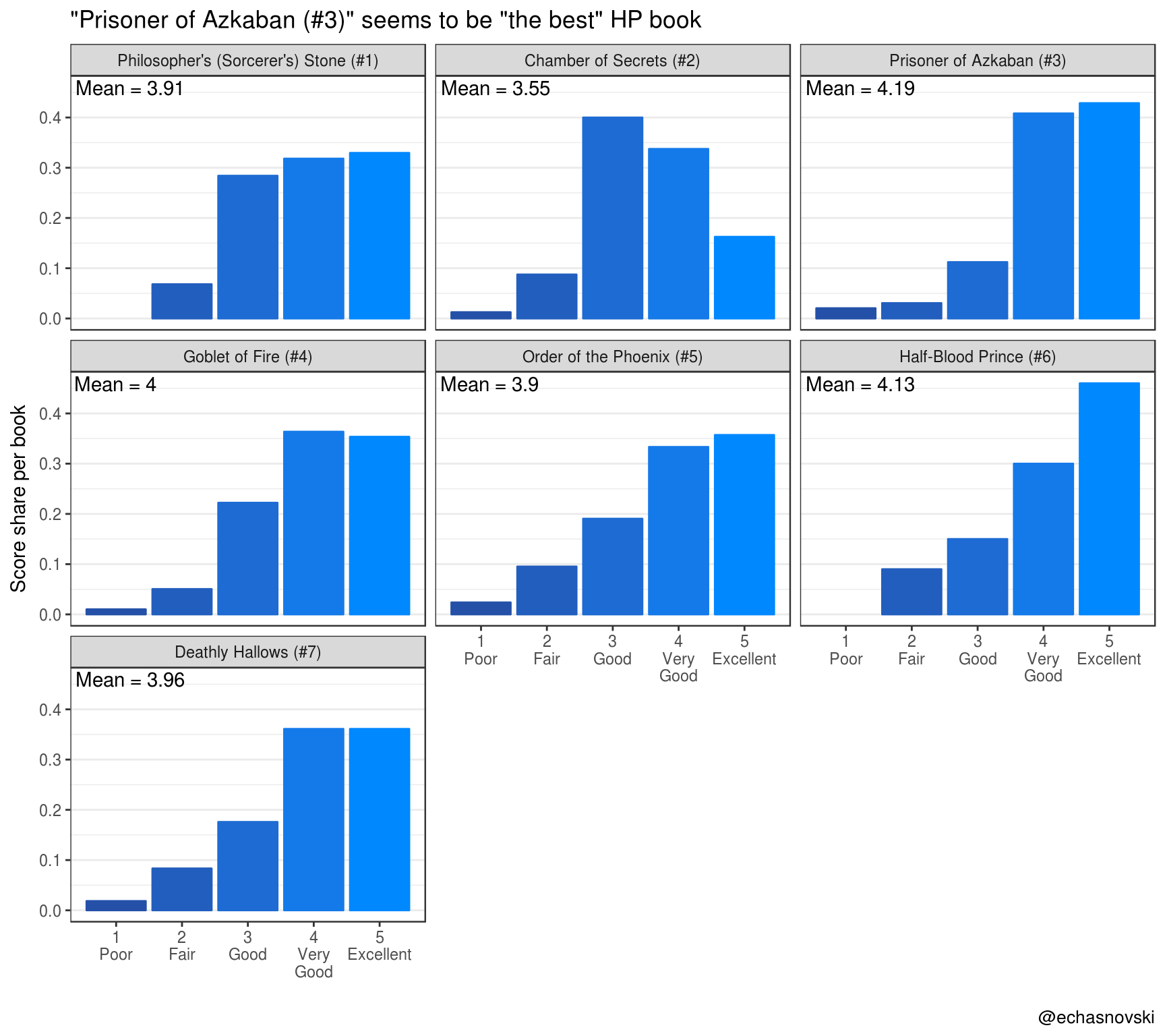 - Among all original Harry Potter books, “Harry Potter and the Prisoner of Azkaban” seems to be considered “best” among R users. “Harry Potter and the Chamber of Secrets” suffers the opposite fate.