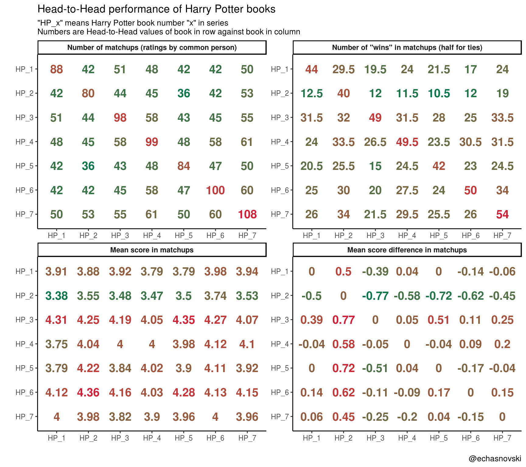 - “HP_7” scored over “HP_2” (“Chamber of Secrets”) the most wins (34, half for ties) as did “HP_6” (“Half-Blood Prince”) over “HP_7”.