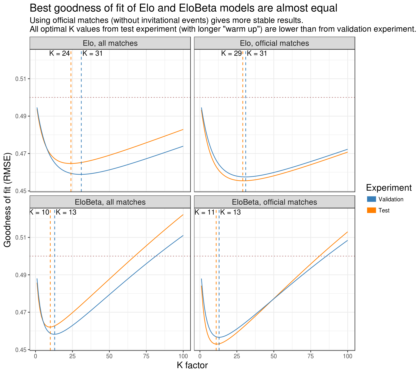 Of course, Elo model has its (fairly high-level) practical issues. However, the most important for our research is that “it thinks” that all matches are played in uniform conditions. It means, that match length isn’t taken into account: winning in “4 to win” match is rewarded the same as winning in “10 to win” match. That is where EloBeta comes into play.