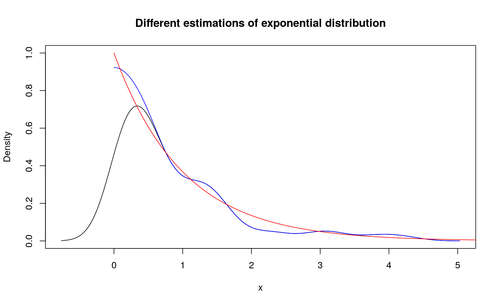 lines(seq(0, 6, by = 0.01), dexp(seq(0, 6, by = 0.01)), col = "red")