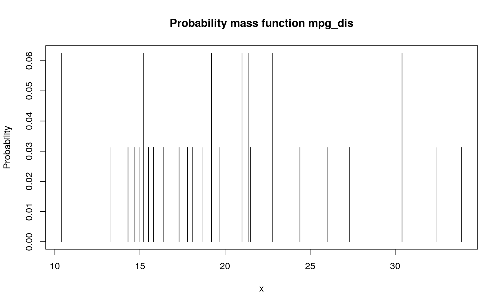 - Type “discrete”: random variable has finite number of output values. Pdqr-function is explicitly defined by the collection of its values with their corresponding probabilities. Usually used when underlying distribution is discrete (even if in theory there are infinite number of output values).